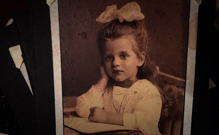 Five hand aged photos mounted onto black board with corners. The photo is removable and bears the name of a child on the back. This is handwritten on each photo.