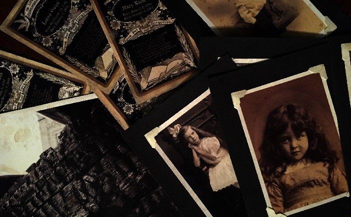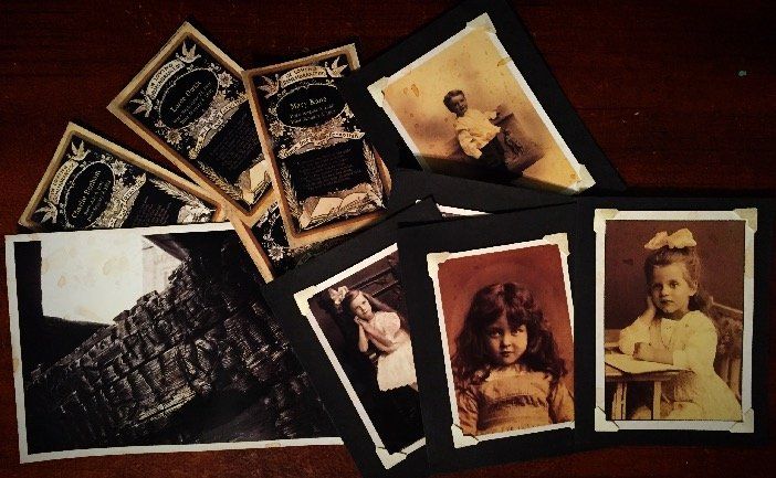 Five hand aged memorial cards bearing the names and dates of the death of each child.